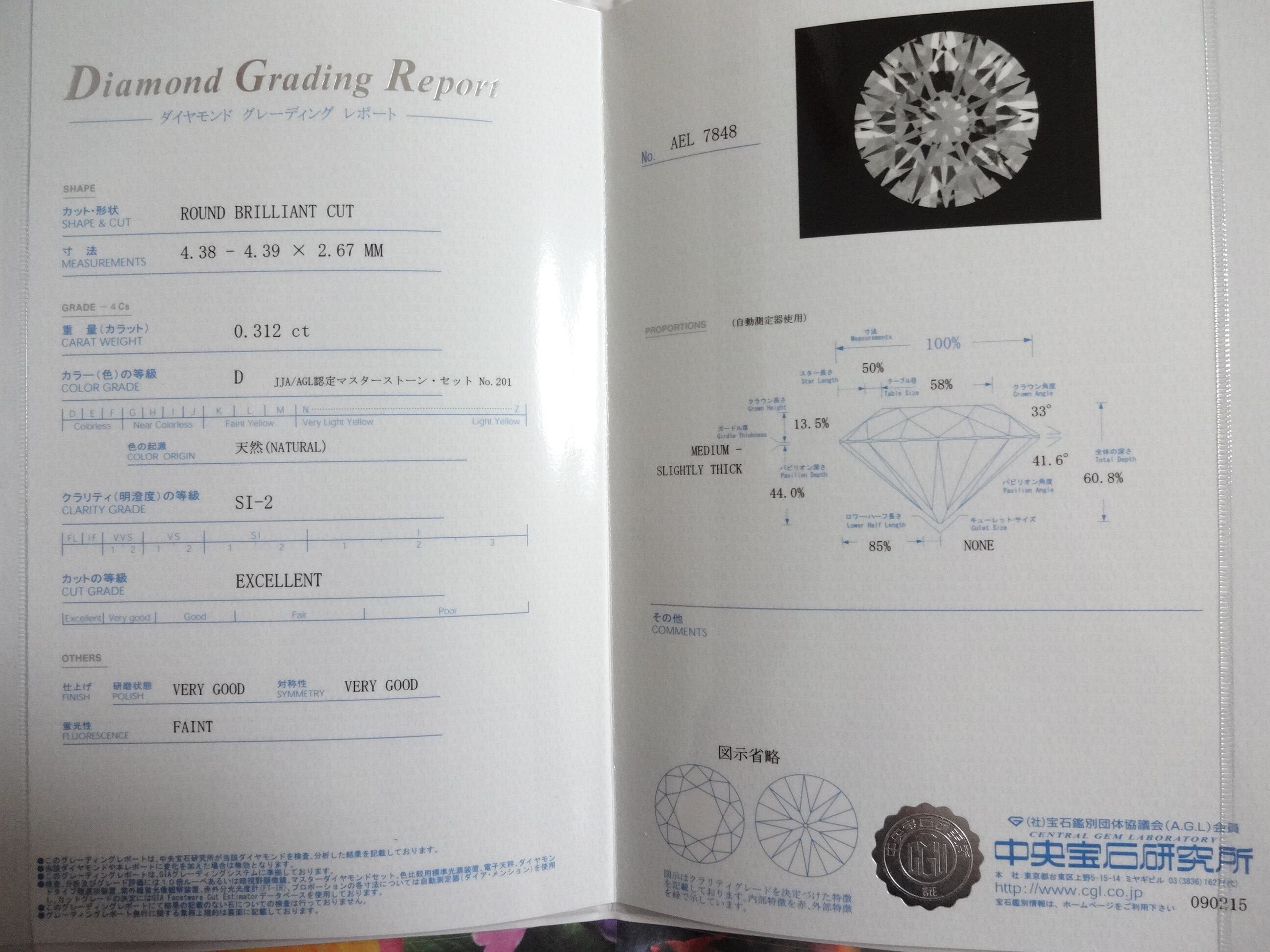 カラーとカットが最高級のダイヤで信頼の中央宝石研究所の鑑定書と簡易鑑定書2つ付きです。