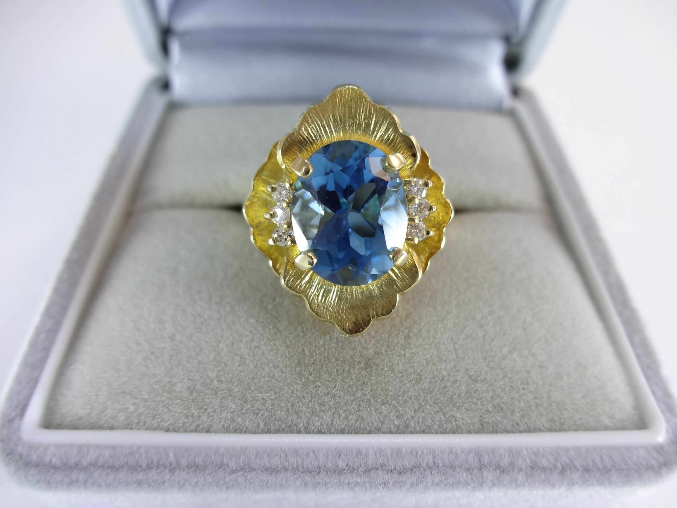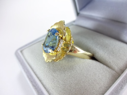 爽やかなカラーのブルートパーズと脇石には片側3つずつダイヤでコーディネートされ、更にお花のモチーフの台が2段になっておりとても美しいデザインとなっております。