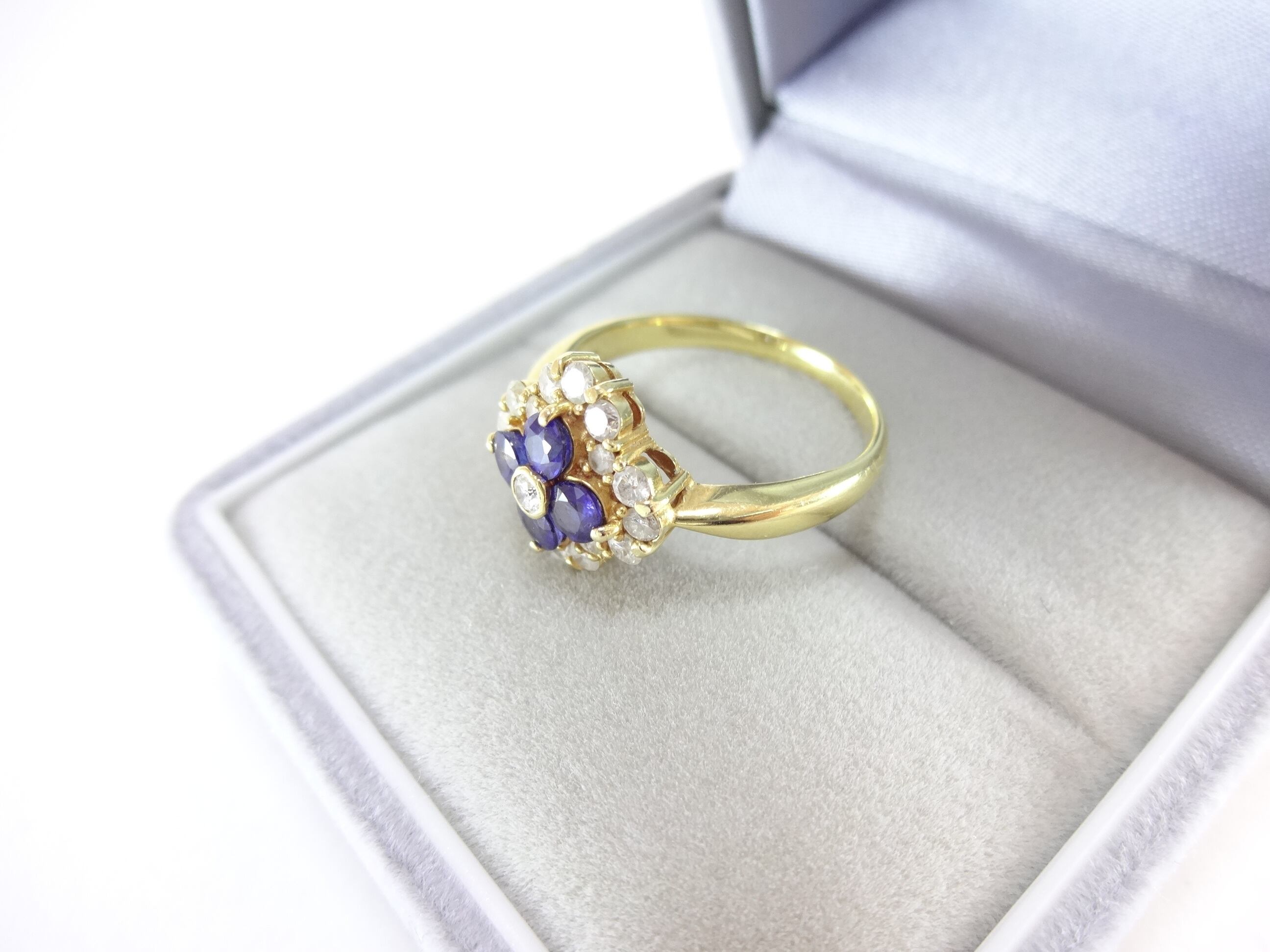 ブルーサファイヤとダイヤモンドのコンビでお花モチーフの美しい豪華なデザインリングです。丁寧にセッティングされた素敵なリングです。