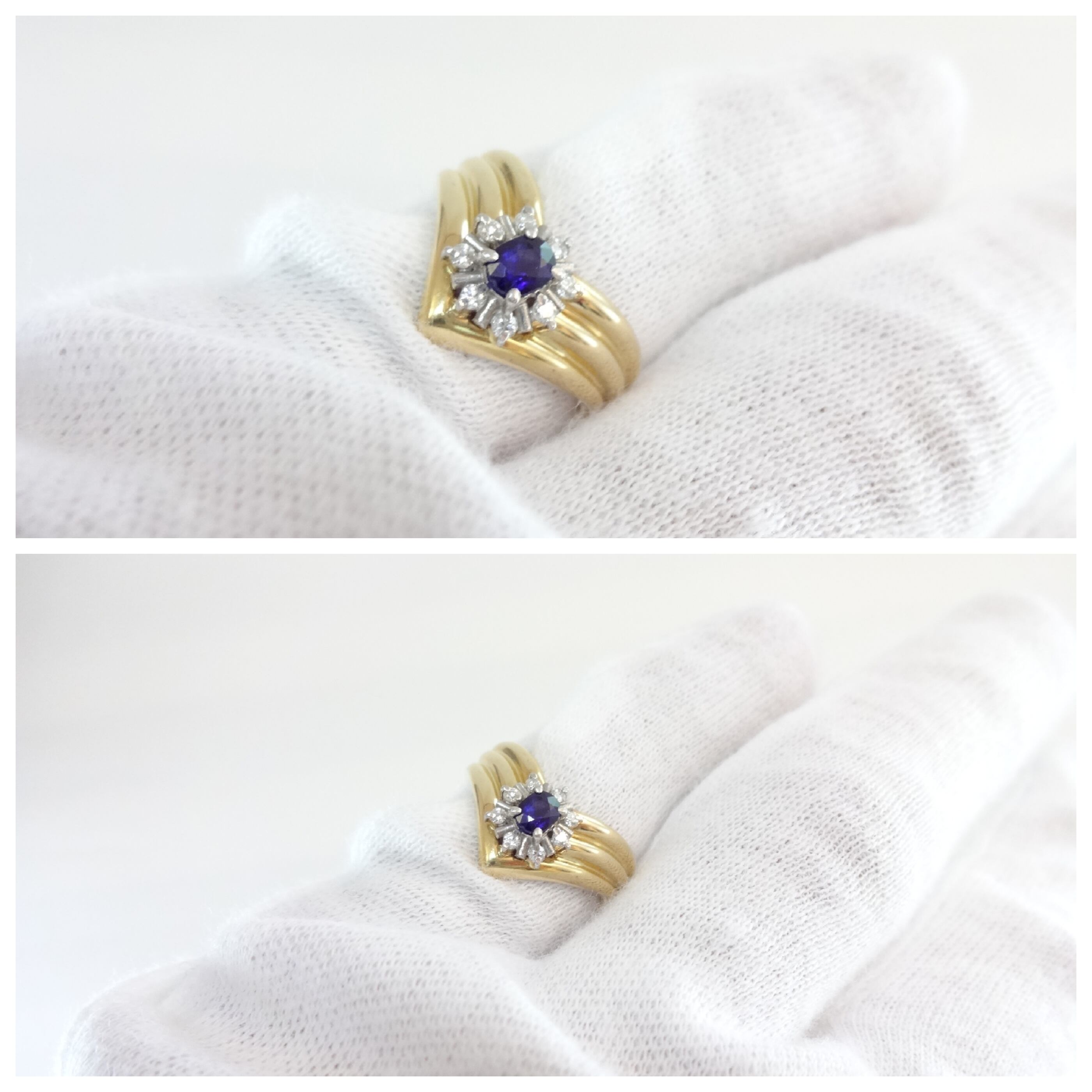 中石にはブルーサファイヤとそれを囲むように脇石にはダイヤモンドをあしらっており、更にV字デザインがエレガントな印象を演出してくれるリングです(^^♪