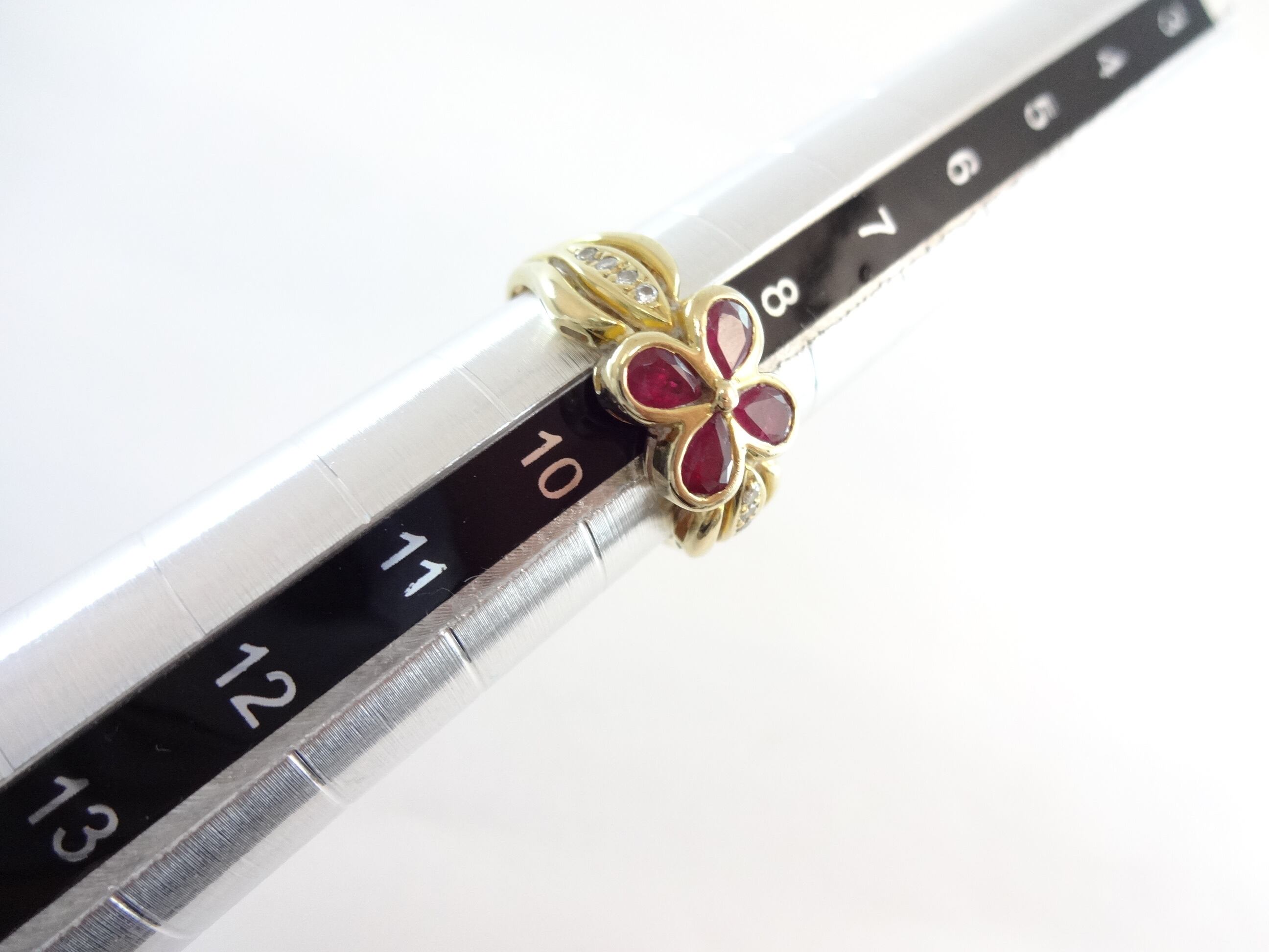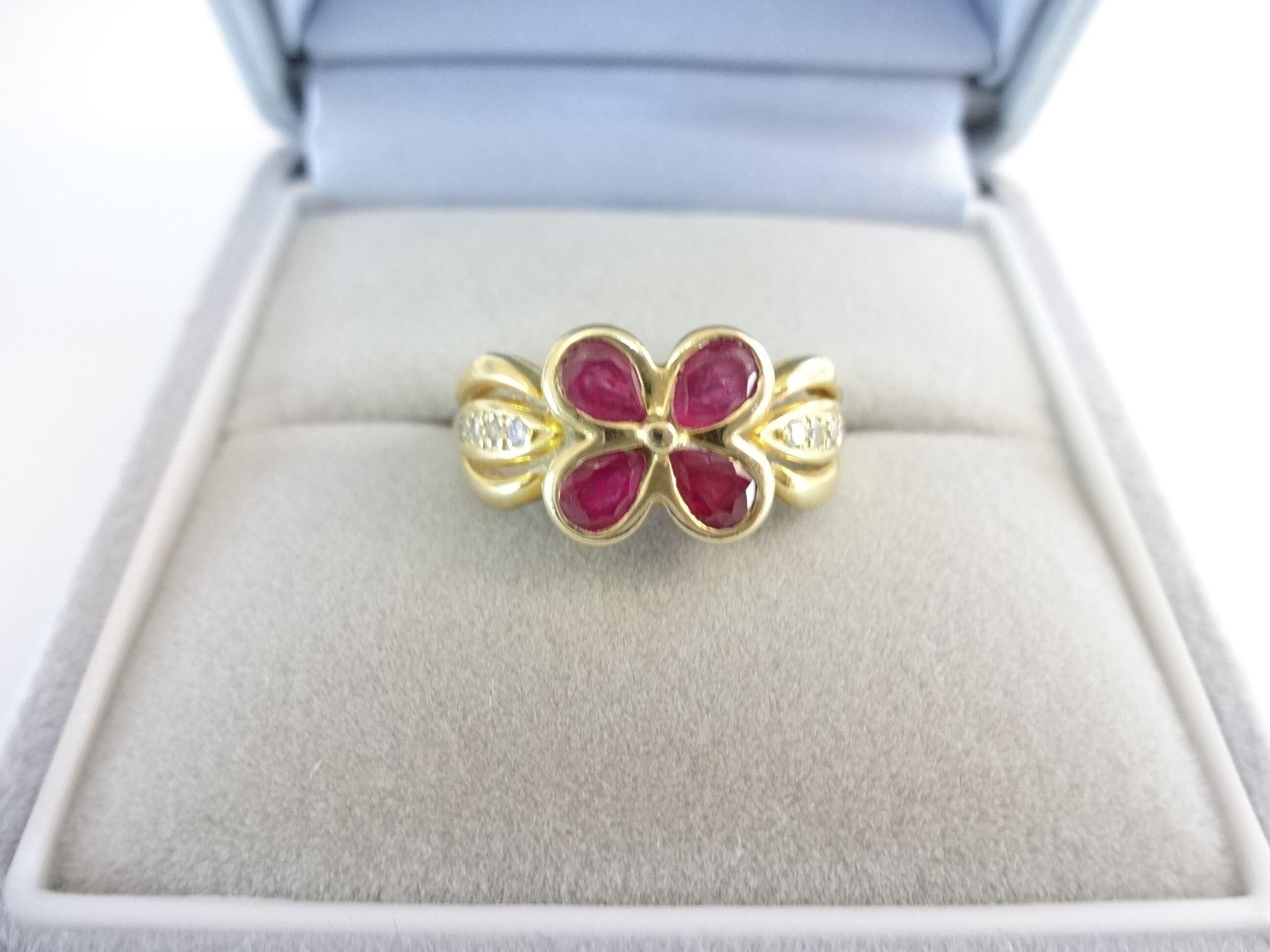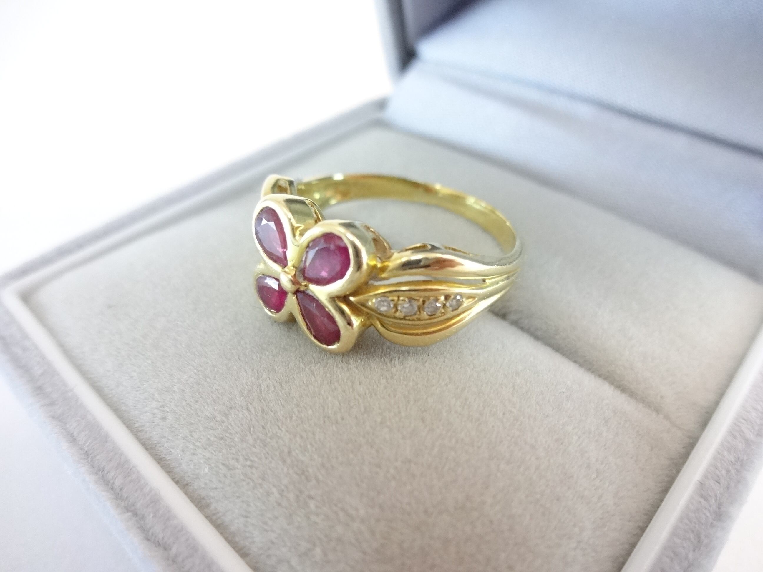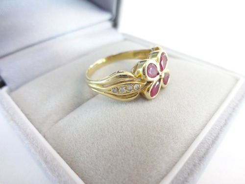 ルビーとダイヤモンドのコンビでお花モチーフの美しい豪華なデザインリングです。丁寧にセッティングされた素敵なリングです。