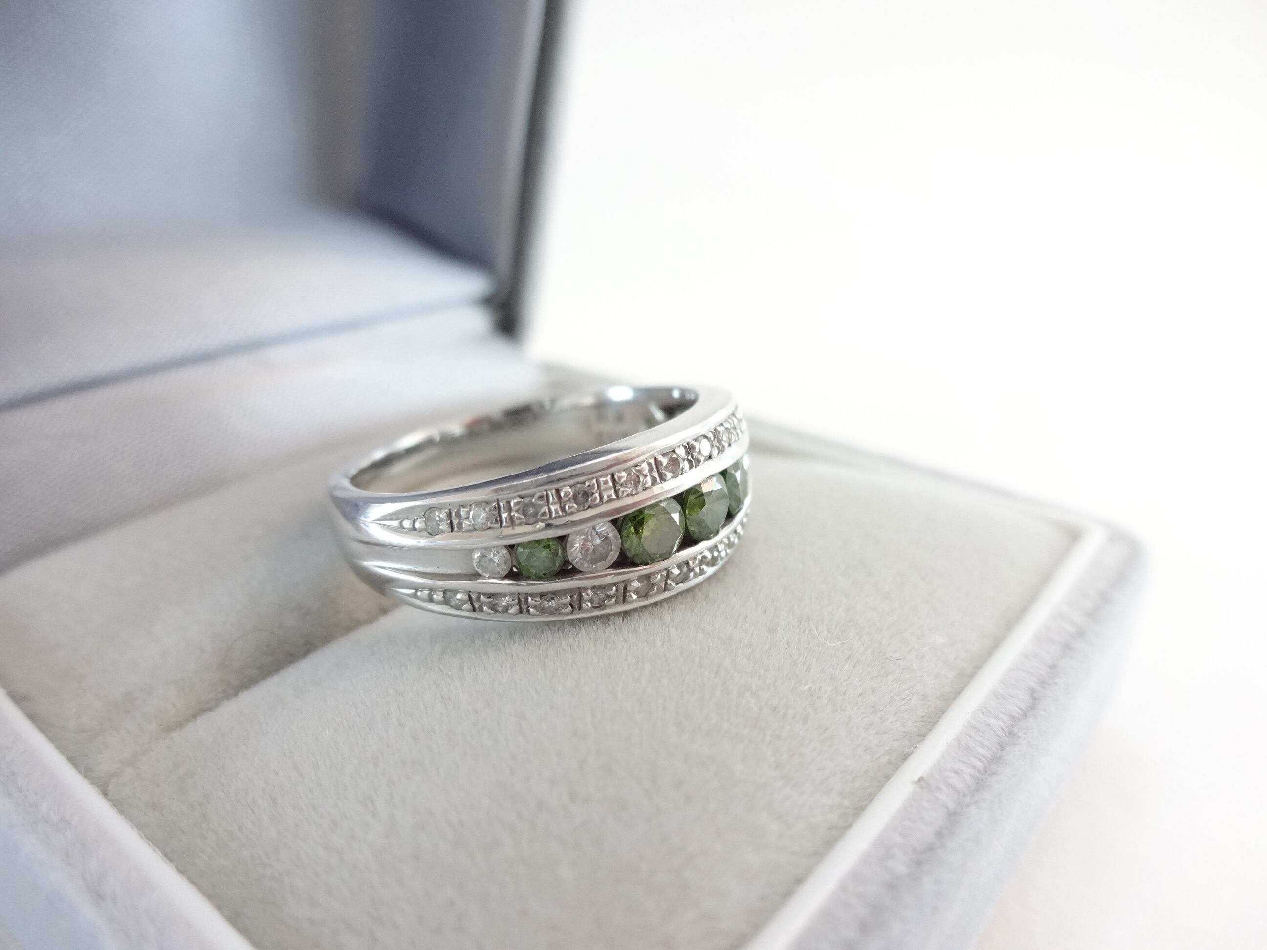 鮮やかなイエローグリーンのペリドットとその上下にはダイヤを豪華に使用した上質なリングです。
