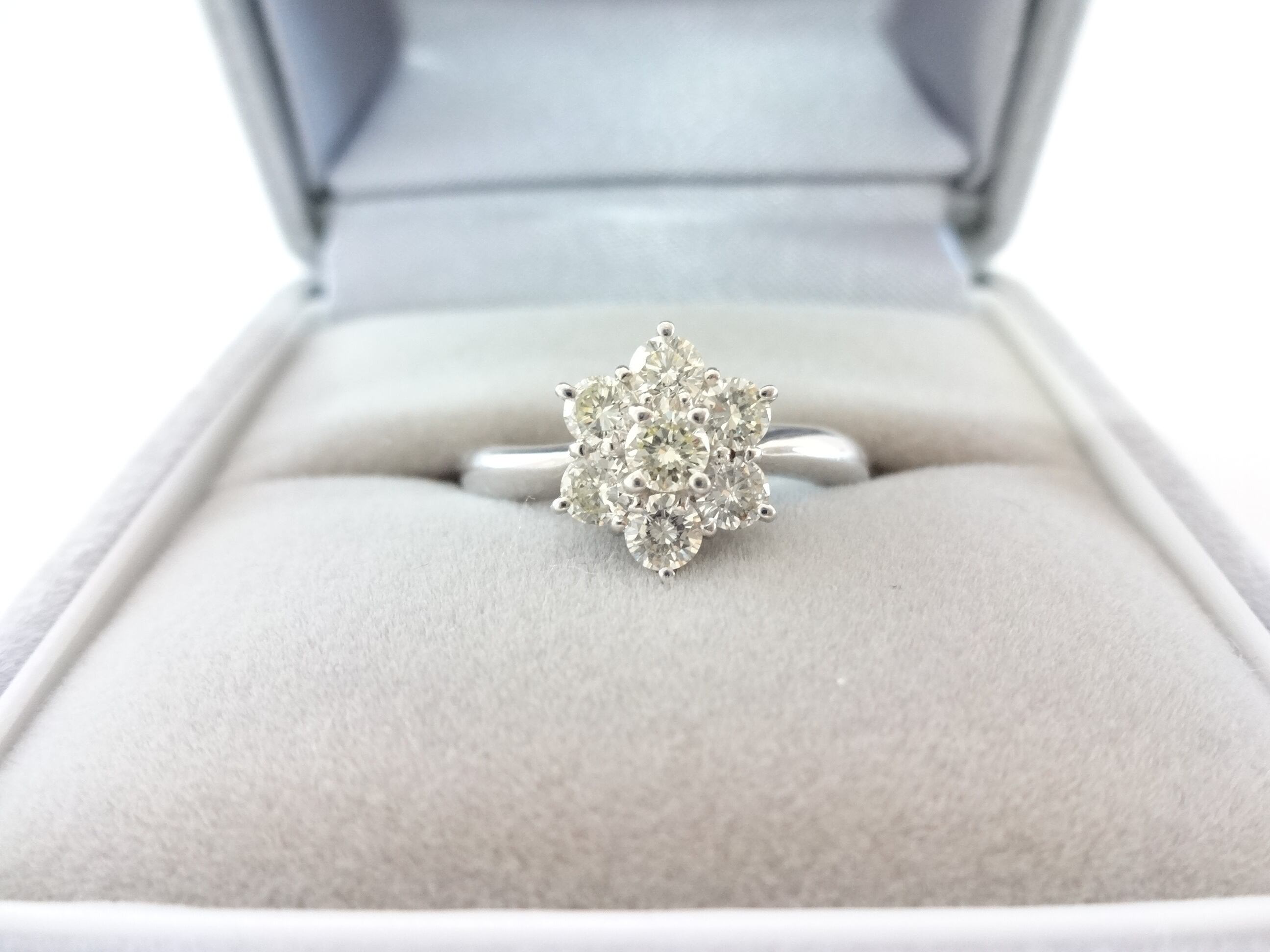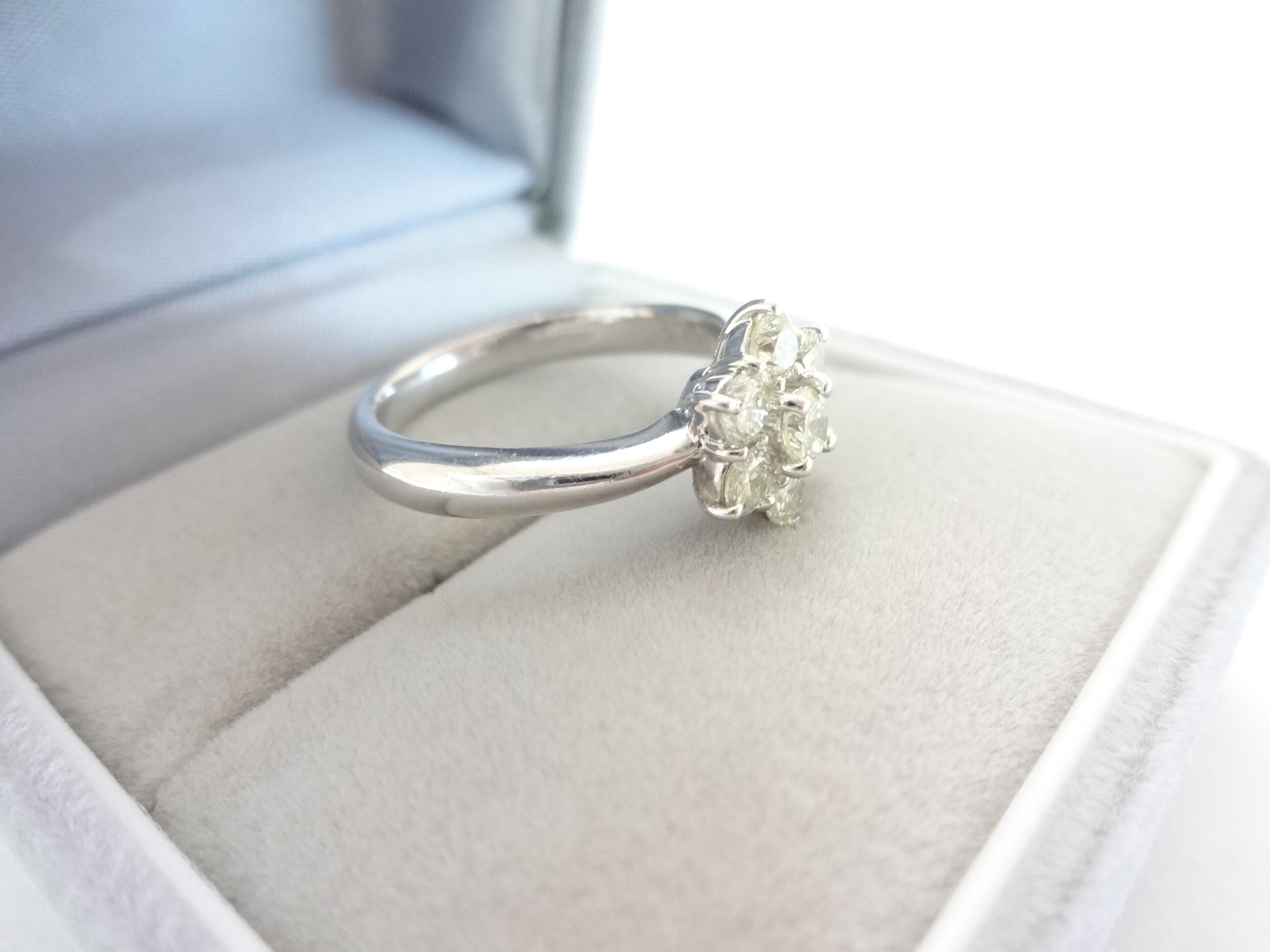 ベリーライトイエローのダイヤ6石が中心の中石ダイヤを囲うように丁寧にセッティングされたリングです。