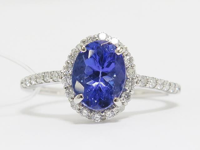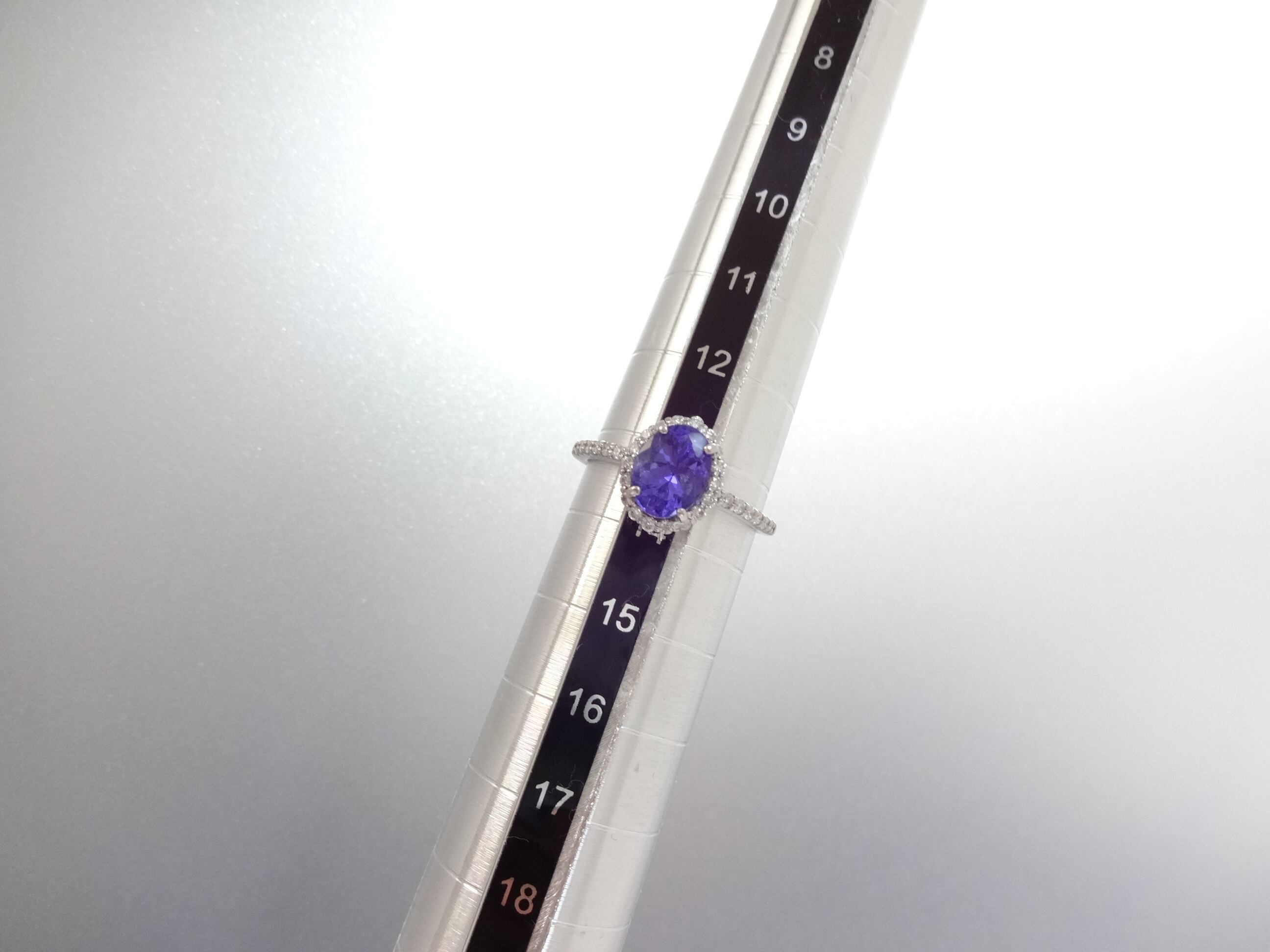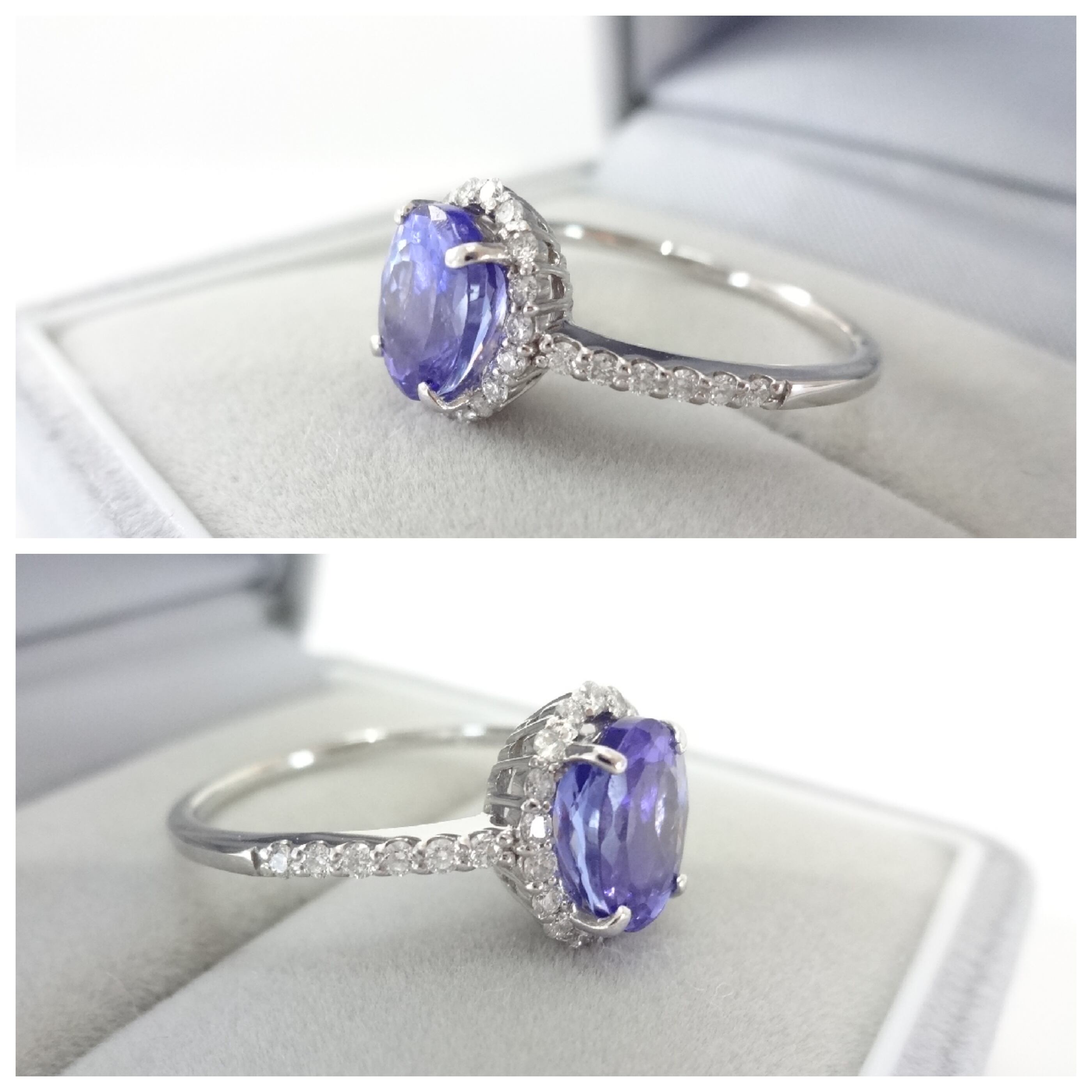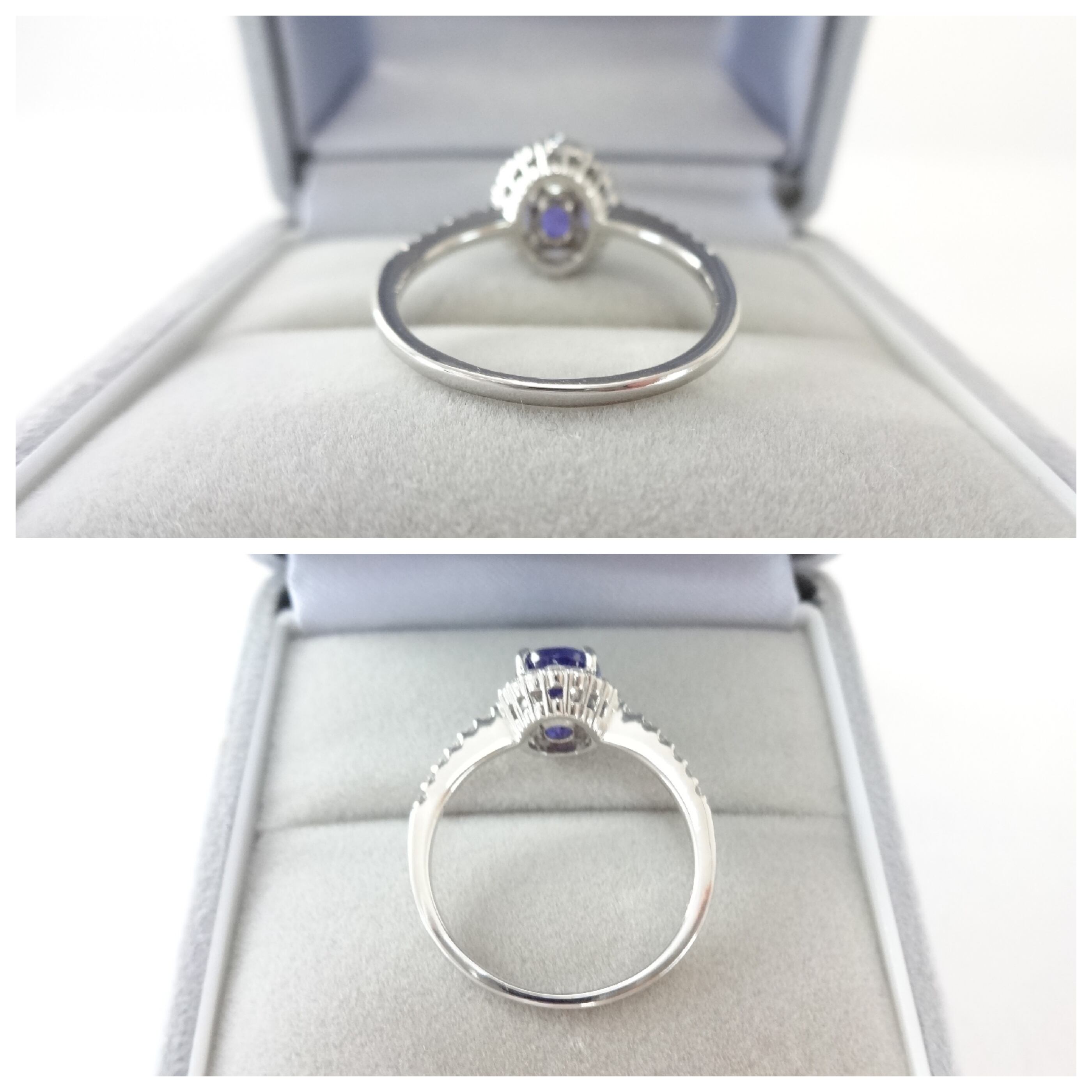 脇石にはダイヤが丁寧にヘイローセッティングされ、中石の1.83ctものタンザイナイトを妖艶に演出してくれます☆