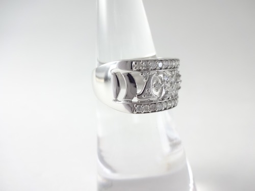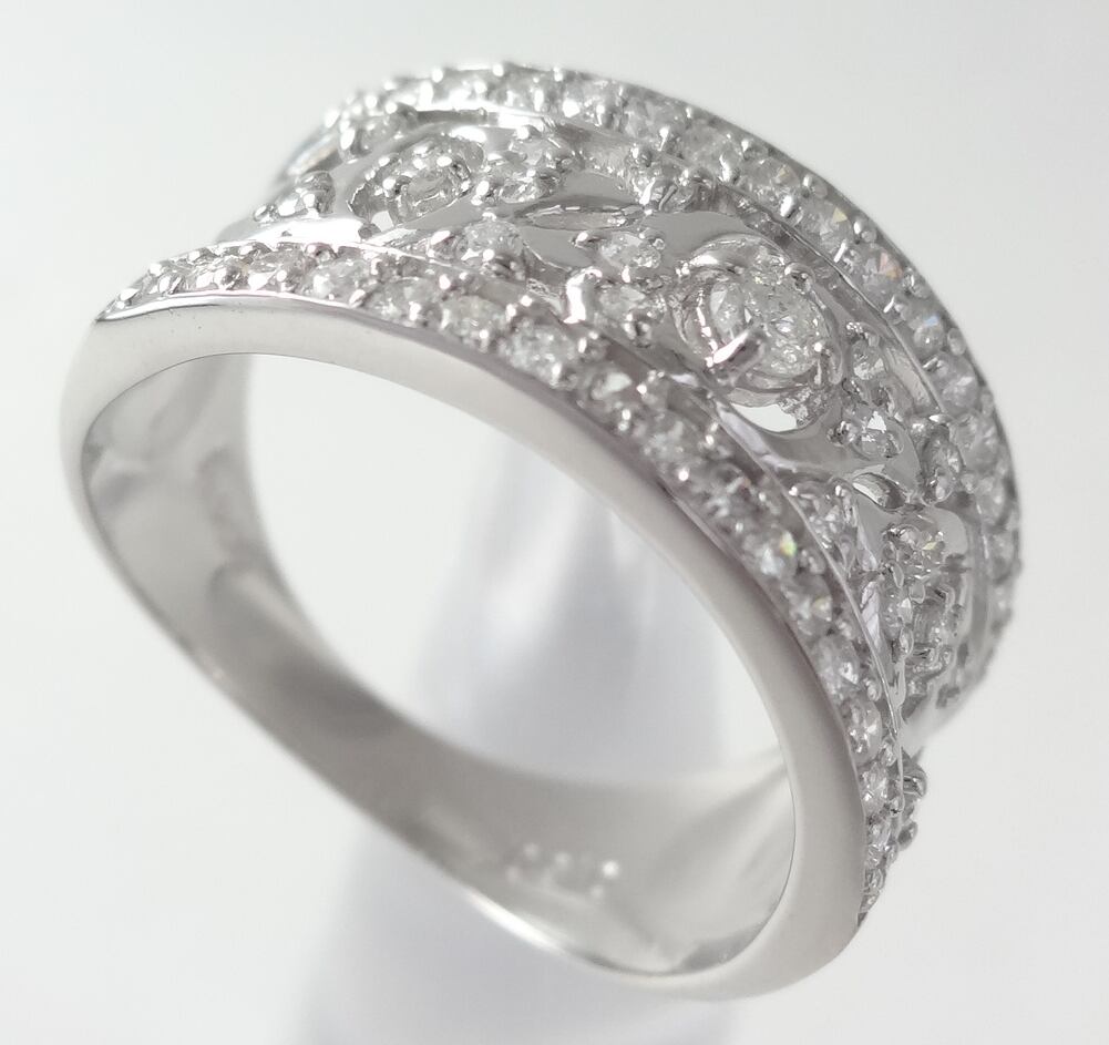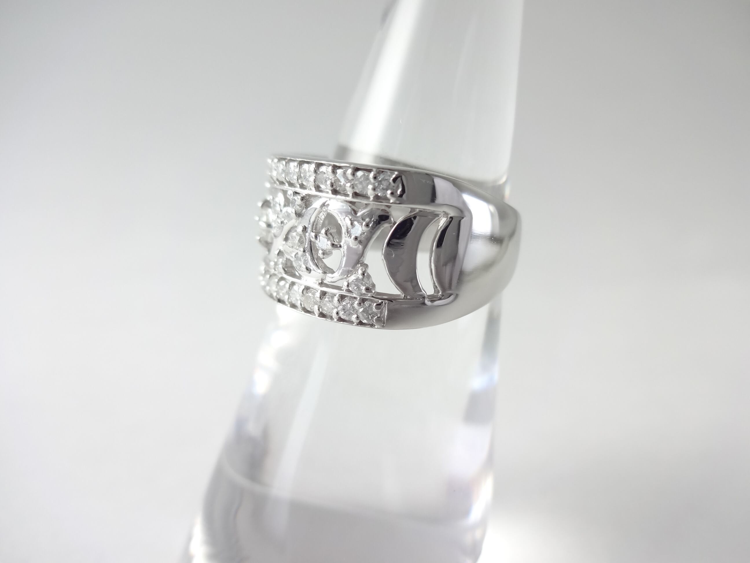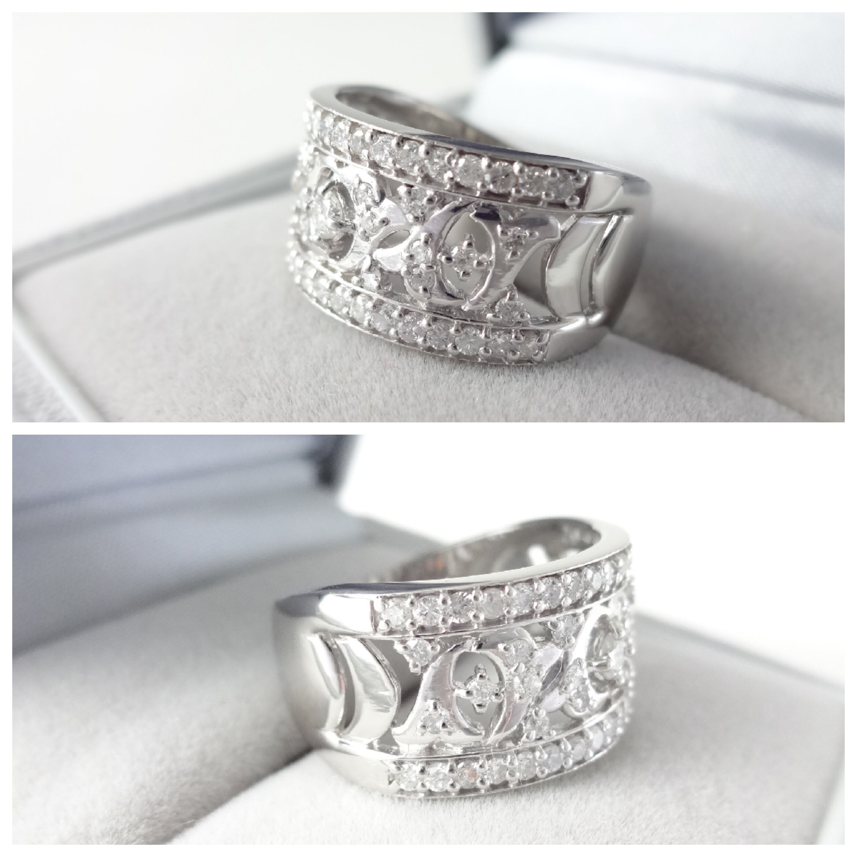 中心にはクラシカルな彫金を施し、更にその上下にはパヴェダイヤを綺麗にセッティングした総カラット0.50ctのエレガントなリングです。