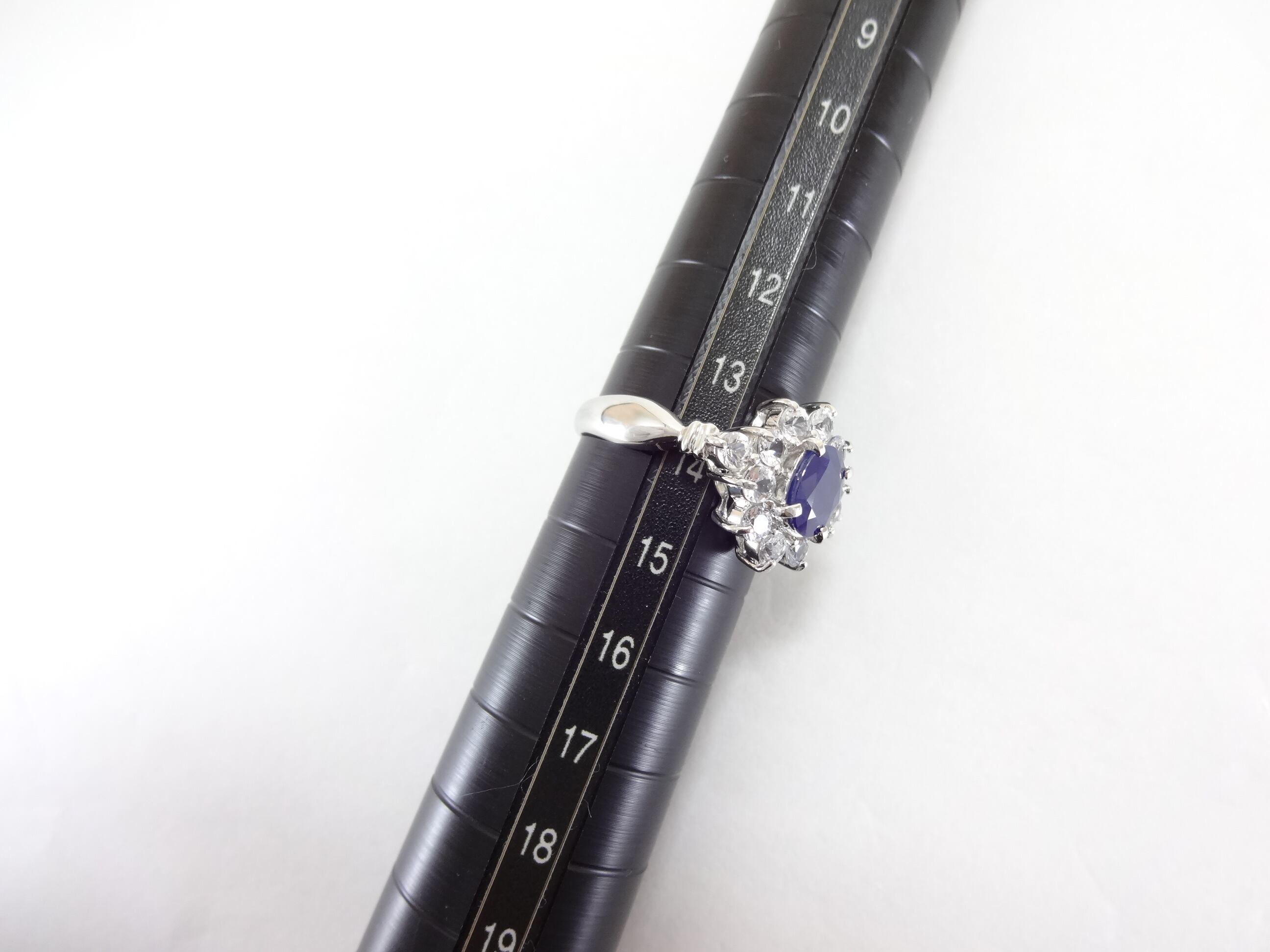 ロイヤルブルーが華やかなサファイアと、その周りにはホワイトサファイアで取り囲むヘイローセッティングでエレガントなリングです(^^♪